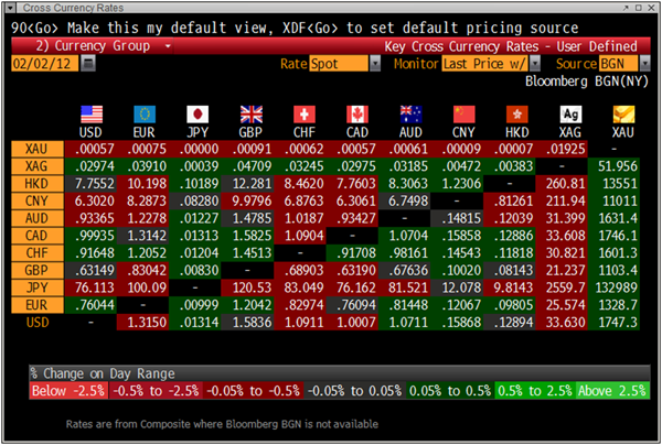 Gold Challenges Resistance at $1,750/oz – Technicals and Fundamentals Remain Very Positive Gold’s London AM fix this morning was USD 1,747.50, EUR 1,326.68, and GBP 1,102.80 per ounce. Yesterday's AM fix was USD 1,744, EUR 1,327.65, and GBP 1,106.74 per ounce. Cross Currency Table - BloombergAdding to the very gold supportive interest rate backdrop, Japan's finance and economic ministers are putting pressure on the Bank of Japan to consider easing monetary policy even further. Negative yields on some bonds (such as TIPS) are very gold positive as are moves to let investors buy short term bills with negative yields. Gold is also being supported by central bank buying. Russia's gold and foreign exchange reserves rose to $504 billion in the week to Jan. 27 from $499.7 billion a week earlier. Newcrest Mining, the world's third largest gold producer, expects gold to trade as high as $2,500 an ounce and retain its safe harbour status for as long as the world's financial system remains in crisis. SILVER Silver is trading at $33.72/oz, €25.66/oz and £21.30/oz. PLATINUM GROUP METALS Platinum is trading at $1,618.00/oz, palladium at $689/oz and rhodium at $1,400/oz. | ||